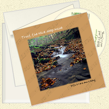A CD of an original song inside a beautifully crafted 6x6 inch note card with matching envelope and paperboard mailer. The song lyrics are printed on the back of each card using recycled paper and green earth technology.