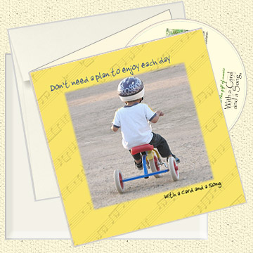 A CD of an original song inside a beautifully crafted 6x6 inch note card with matching envelope and paperboard mailer. The song lyrics are printed on the back of each card using recycled paper and green earth technology.